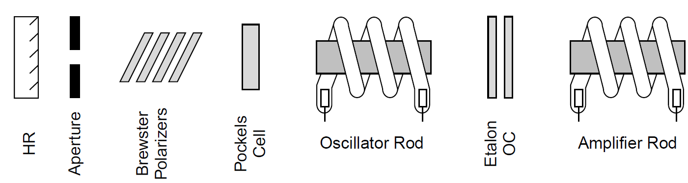 The structure of a ruby laser can vary from a simple design with integral mirrors deposited directly onto the faces of the rod, to a complex design featuring a plethora of optical elements, such as Q-switches, mode-limiting apertures, and single frequency selectors within the cavity. The optical train of a relatively complex ruby laser, a double-pulse ruby laser used for holography, is depicted in Figure 1.1. The cavity resonator itself consists of a dielectric high reflector and an etalon for an output coupler, the etalon being used to ensure single-frequency operation of the oscillator. Whereas the etalons as transmission filters with transmission peaks corresponding to the FSR of the etalon, this particular etalon is a reflector, reflecting wavelengths separated by the FSR. In that respect, it simply replaces the broadband OC normally used in a laser. The single-frequency operation of this laser increases the coherence length to about 10 m, desirable when using this laser as a source for holography. Aside from frequency stability, spatial quality is also ensured through the use of a variable aperture in the optical train, which serves to limit the transverse mode of the laser to TEM00 mode.