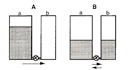 In this analogy the volume of water in a tank is analogous to the concentration of reactant or product and the height (potential energy) is analogous to its chemical potential. Initially (A), there is a large amount of reactant (a) but no product (b). The reaction will therefore flow to the right until equilibrium is reached. The enzyme is equivalent to the tap in this model.