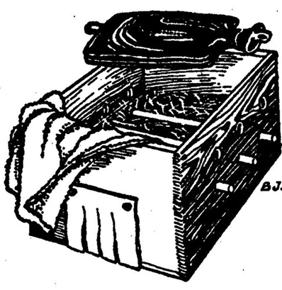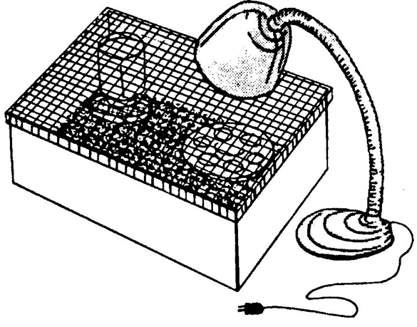 يسمر بداخل الصندوق في جميع الجوانب قطع خشبية سمك بوصة على ارتفاع 7 بوصة من الأرضية . وهذه القطع حوالي 18 بوصة مع وجود ثقب في الوسط يتسع لمدخنة لمبة الكيروسين (أو مثبت اللمبة الكهربائية) واذا استعملت لمبة كهربائية يفضل وجود عاكس معدني لكي يعكس الحرارة .