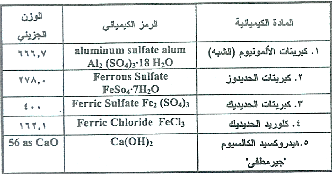 جدول ﴿1-1﴾: الكيماويات المستخدمة في معالجة مياه الصرف الصناعي