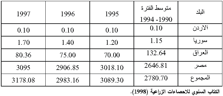 جدول(1) اعداد الجاموس في الدول العربية (الف راس) للفترة من 1990-1997