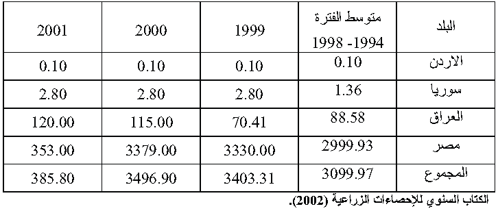 جدول(2) اعداد الجاموس في الدول العربية (الف راس) للفترة من 1994-2001