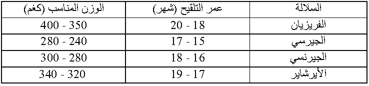 جدول يبين العمر والوزن المناسب لتلقيح عجلات الحليب