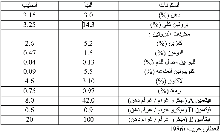 جدول (1) الفرق بين تركيب الحليب واللبأ في اليوم الأول بعد الولادة مباشرة
