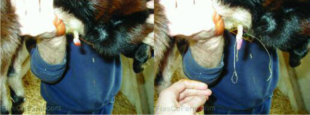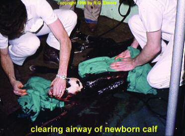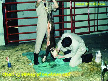 يجب هنا التأكد من قطع الحبل السري واذا لم يقطع فيجب قطعه بطول 10 سم عن البطن وربطه ومن ثم إزالة المواد المخاطية والاغشية الجنينية من حول المنخرين لتسهيل عملية التنفس، واذا تأخر التنفس فيمكن تدليك منطقة الصدر من الجانبين وعند بدء عملية التنفس يلاحظ أحياناً سعال الحيوان، وهنا يجب وضعه في منطقة مائلة ورأسه للأسفل لخروج السوائل الجنينية التي قد تكون قد دخلت الى الرئتين او حمل الحيوان من الارجل الخلفية ورأسه للأسفل لتسهيل عملية خروج السوائل. واذا تأخر التنفس فيمكن سكب الماء البارد على راس الحيوان لتنبيهه واسراع عملية التنفس. اما اذا حدث ولم يستطع الحيوان من التنفس بعد كل تلك العمليات فيستخدم التنفس الاصطناعي لإنقاذه من الموت.