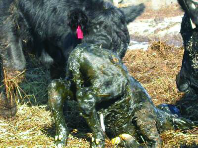 شكل (3) المولود حال ولادته مباشرة – لاحظ السوائل الجنينية على جسمه وقيام البقرة بلعقة وتنظيفه