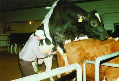 عملية جمع السائل المنوي من الثور بعد وثوبه على بقرة حقيقية