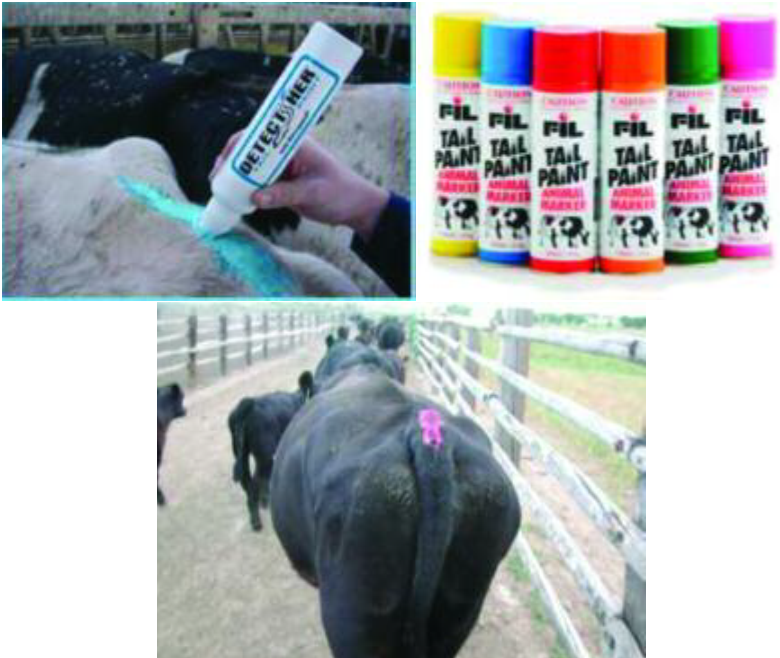 يمكن ان تؤدي اصباغ الذيل دورا مها في الكشف على ما اقبل دورة الشبق في الماشية، وتطلى قمة الذيل بعرض 10 سم وطول حوالي 20 سم. ان إزالة جزء او الطلاء كله من على ذيل الحيوان يشير الى البقرة قريبة من او في حالة الشبق، وهذه الطريقة تعد أيضاً من الطرائق الحديثة للكشف عن حالة الشبق في قطعان الماشية الكبيرة العدد والتي لا يمكن السيطرة عليها ومراقبة دورة الشبق لها لكثرة عددها.