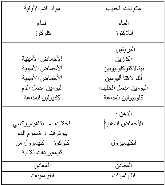 جدول (1) مواد الدم الأولية المكونة لحليب المجترات