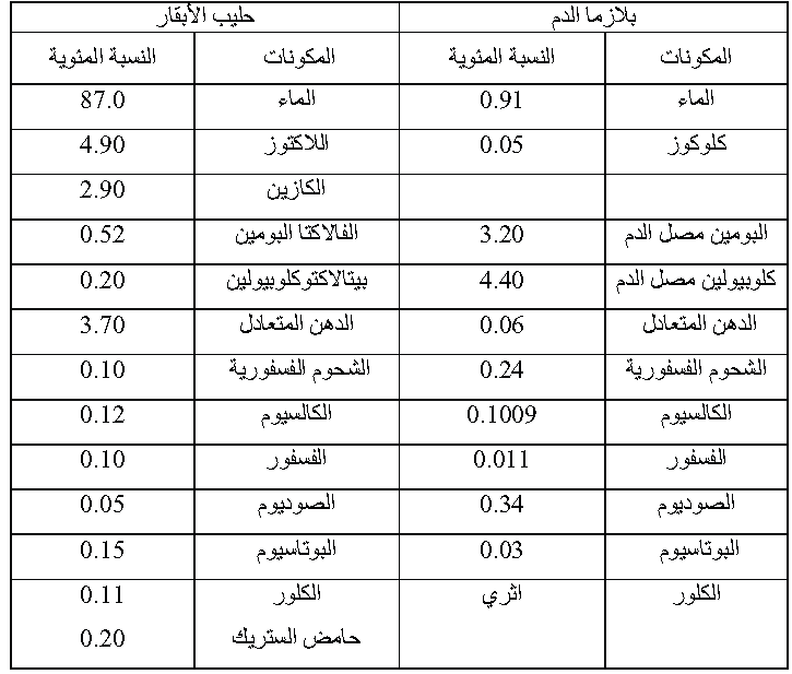 جدول (2) مقارنة بلازما الدم وحليب الأبقار