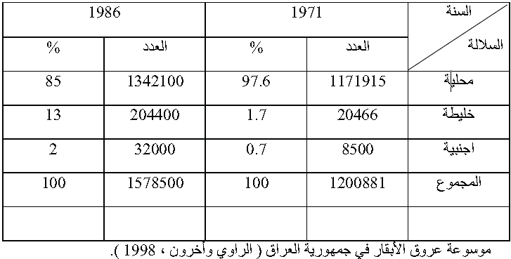 جدول (2) تطور أعداد الأبقار حسب السلالة لعامي 1971و1986