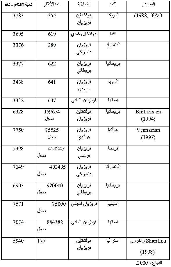 جدول يبين إنتاج أبقار الفريزيان والهولشتاين – فريزيان في دول مختلفة من العالم