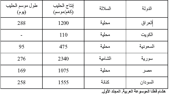 - عدم وجود الجمعيات المتخصصة بماشية الحليب سواء كانت أبقار او جاموس لما لها من دور في مساعدة وتشجيع المربين على الاهتمام بمشاريع إنتاج الحليب. يوضع الجدول (1-6) إنتاج الأبقار المحلية من الحليب وطول موسم الحليب.