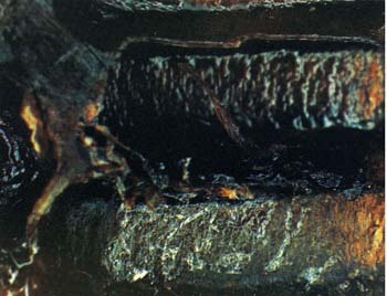 مقطع عامودي في العين السداسية يظهر الحضنة الميتة مستلقية في العين السداسية وقد تحولت إلى قشور.