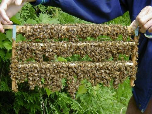 أ- على طرد تم تقسيمه حديثاً. ب - طائفة عديمة الملكة. ج - نواية للتلقيح.