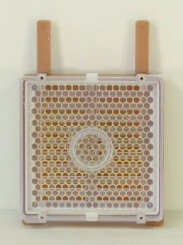 2- قم بفك الغطاء الخلفي لقفص جنتر البلاستيكي ثم أدخل الحافظة A من الفتحة الضيقة التي بها الشمع وذلك في حامل الحوافظ (الذى يحوى 95 عين) فتواجه العين السداسية البلاستيكية المفتوحة في القفص البلاستيكي والتي تعمل في هذه الحالة كجدران مبدئية للعين السداسية, وبعد ملا عدد العيون المطلوبة (أقصاها 90 عين) يتم تثبيت الغطاء الخلفي في القفص البلاستيكي بشريط لاصق.