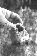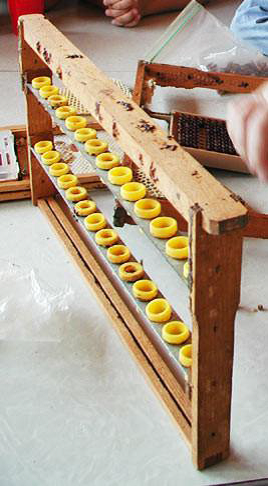 1- افرد فرخ شمع أساس مطبوع عليه العيون السداسية وادهنه بالعسل, ثم قم بضغط الحافظة البلاستيكية A من جهة فتحتها الضيقة بواسطة القلم البلاستيكي على فرخ الشمع من الجهة غير المدهونة بالعسل بحيث يكون منتصف الفتحة الضيقة للحافظة عند قمة العين السداسية المطبوعة فتنفصل قطعة دائرية من الشمع تملؤ وتسد الفتحة الضيقة للحافظة مكونة قاع مقعر للعين السداسية وذلك مثل القاع الطبيعية الشمعية المهيأة لوضع البيض.