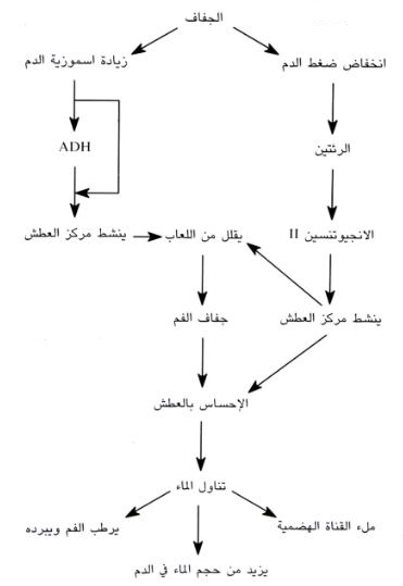 يتحسس الجسم للنقص في مستوى الماء من خلال مركز العطش بسبب العوامل المذكورة مؤديا إلى تناول الماء الذي بدوره يعمل على ترطيب الفم وتبريده وزيادة حجم السائل بالدم وتعبئة القناة الهضمية.