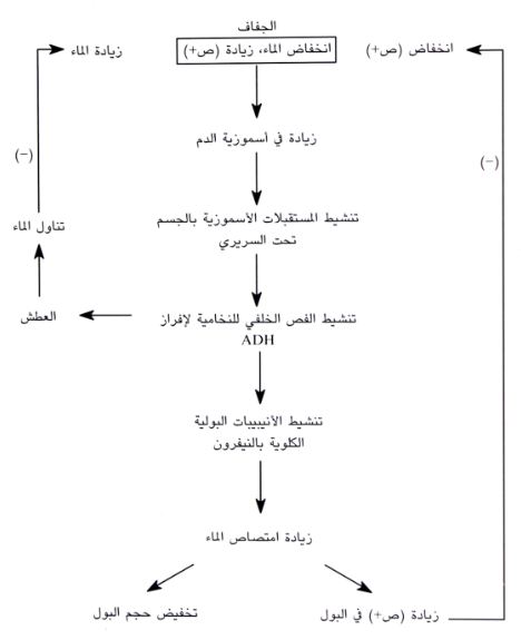 الهرمون المضاد لإدرار البول (ADH) يلعب دوراً اساسياً في المحافظة على الماء داخل الجسم. عندما يتعرض الجسم إلى الجفاف نلاحظ انخفاض في حجم الدم وزيادة في تركيز الصوديوم (زيادة في الضغط الأسموزي). زيادة أسموزية الدم تزيد من نشاط المستقبلات الأسموزية بالجسم تحت السريري التي بدورها تحفز إفراز هرمون (ADH) واطلاقه من الفص الخلفي للنخامية. هرمون (ADH) يعمل على اعادة امتصاص الماء من الأنابيب الكلوية (انظر الجهاز البولي).