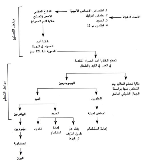 2- تتحطم خلية الدم الحمراء أثناء مرورها بالأوعية الدموية ويتم التقاط مخلفات التحطم بواسطة الأجهزة البلعمية الموجودة داخل (الجهاز الشبكي البطاني الداخلي (Endoplasmic Reticular System في كل من الكبد والطحال.