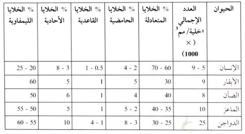 جدول 1: عدد خلايا الدم البيضاء ونسبة أنواعها المختلفة في عدد من الحيوانات