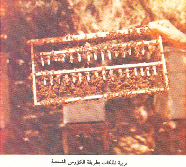 4- يؤخذ قرص محتوي على بيض ويرقات حديثة السن. من احدى الطوائف الممتازة التي تم اختيارها للتربية من يرقاتها ويوضع هذا القرص بين اقراص الطائفة اليتيمة التي رفعت ملكتها – فتقوم الشغالات ببناء بيوت الملكات على البيض او اليرقات الصغيرة في القرص الذي تم انزاله للطائفة.