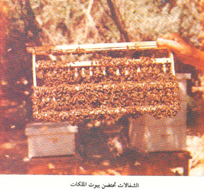 5- بعد عشرة أيام تكون بيوت الملكات جاهزة للنقل الى النويات فيقطع من القرص الشمعي قطع مربعة بكل منها بيت ملكي ويوضع بين اقراص الحضنة بالنوية في وضعه الطبيعي أي قمته لأسفل.
