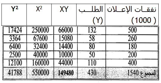 مثال ( 7-3): تقوم شركة بغداد للصناعات الكهربائية بإنتاج العوازل الحرارية الأنبوبية قطر 5 مم. ومن خلال مبيعات السنوات الماضية لوحظ بان هناك علاقة بين نفقات الإعلان والطلب وكما في الجدول التالي:
