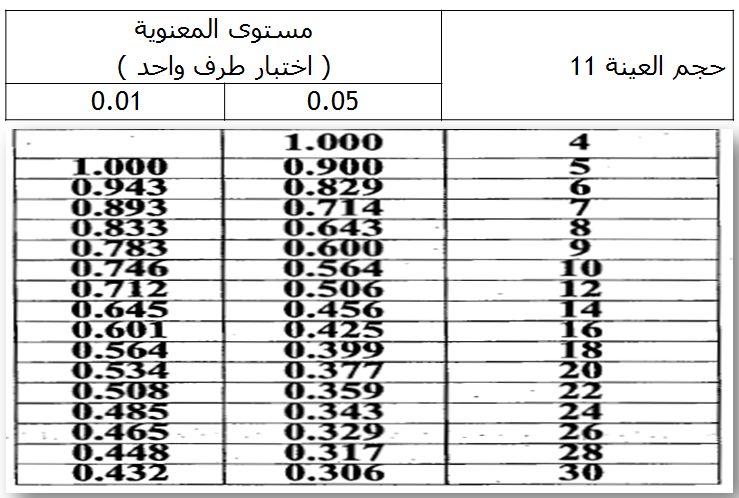2. باستخدام جداول إحصائية، كجدول ( 11-3)، معدة خصيصاً لهذا الغرض نبحث عن القيمة الجدولية المقترنة بـ n =5 وبمستوى معنوية a = 0.05 هذه القيمة = 0.900 .