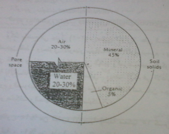 أما الصورة الغازية في الأرض, فهي مثل الجو الخارجي فيتكون من النيتروجين والأكسجين مع كمية أقل من ثاني أكسيد الكاربون وبعض الغازات الأخرى. والنيتروجين غالباً ما يتواجد بكمية كبيرة في هواء الأرض وهو ضروري لغذاء النبات ولكن النبات الراقية لا تستطيع الاستفادة منه مباشرة في صورة غازية. ومع ذلك فبعض الميكروبات يمكنها أن تستخدم غاز النيتروجين وتحويله في اجسامها الى مواد بروتينية تظهر في الجزء العضوي من الأرض . والأكسجين, العنصر الثاني في التواجد في جو الأرض ضروري لجميع العمليات الحيوية التي تحدث في الأرض. فجذور النباتات وكائنات الأرض الاخرى تحتاج الى إمداد مستمر من الأكسجين للتنفس, واستمرار العمليات الحيوية التي تمدهم بالطاقة. ومعدل التنفس يعتمد على تركيز الأكسجين في هواء الأرض, والذي يتوقف على معدل التبادل الغازي بين الأرض والهواء الجوي. وحيث أن تدفق الغاز في الأراضي يتوقف على متوسط حجوم المسام ودرجة امتلاء المسام بالماء, فإن حالة التهوية والتي تتحدد بتركيز الأكسجين في الأرض تكون محكومة بالصورة الصلبة والسائلة.