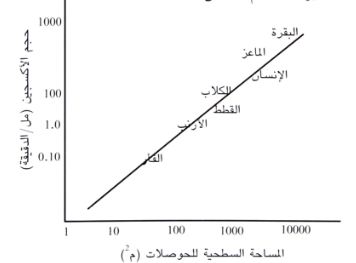 شكل 1 : علاقة مساحة سطح الحويصلات بحجم الاكسجين.