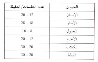 جدول 1: الحركات التنفسية الاعتيادية (نفس / الدقيقة) في بعض الحيوانات