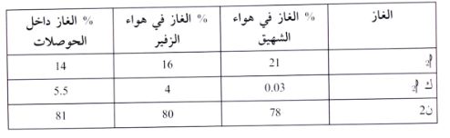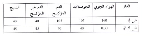 جدول 1: نسبة غازات التنفس في هواء الشهيق والزفير وعلى مستوى الحوصلات الهوائية