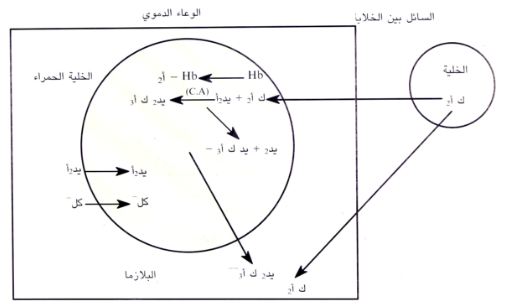 يتكون حامض الكربونيك (يد2 ك أ3) داخل الخلايا الحمراء بواسطة أنزيم (Carbonic Anhydrase, CA). يتأين حامض الكربونيك بعد ذلك إلى يد + و يد ك أ--3 . (الشكل 1).