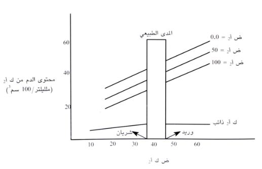 شكل 1 : علاقة (ض ك أ2) بمحتوى الدم من ك أ2