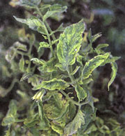 لاحظ ان الاعراض تظهر على الوريقات على شكل تبرقش اي تظهر عليها بقع خضراء باهتة او صفراء مختلفة باللون الاخضر الطبيعي, وفي الاصابات المتقدمة تموت الانسجة في اماكن تلك البقع متحولة الى اللون البني.