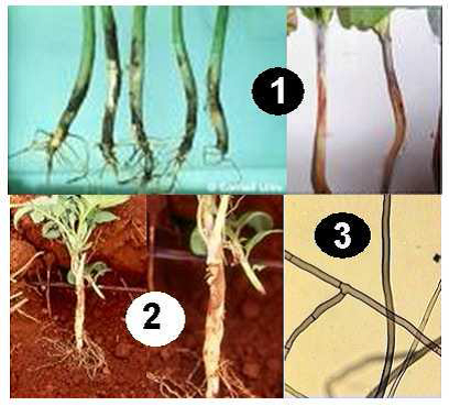 شكل يبين اعراض الاصابة بالفطر ريزكتونيا سولاني على بادرات القن "مرض الخناق" (1), والبطاطس (2), وشكل الهيفات المقسمة للفطر والتفرعات العمودية عليها (3)