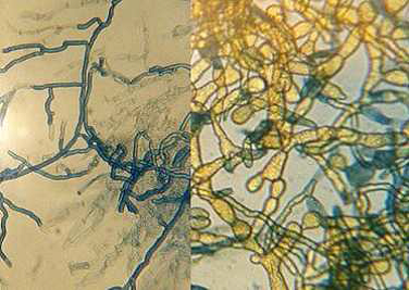 شكل يبين: (يسارا) الفطر ريزكتونيا سولاني (يمينا) طوره الكامل كما يبدو تحت الميكروسكوب
