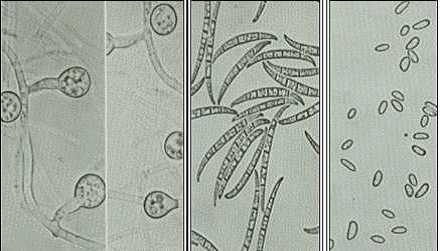 شكل يبين جراثيم الفطر المسبب للذبول. جراثيم ميكروكونيدية (يمينا) – ماكروكونيدية (الوسط) – كلاميدية (يسارا)