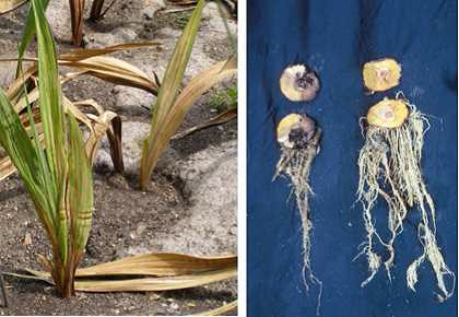 شكل يبين مظاهر الذبول الوعائي على نباتات الجلاديولس (يسارا) ومقطع عرضي يوضح التلون الداخلي في الابصال المصابة مقارنة بالسليمة (يمينا)