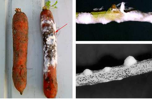 مظاهر الاصابة بالعفن القطني على الجزر وسيقان بعض النباتات