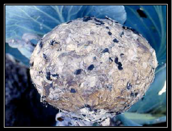 اعراض العفن القطني على الكنب – لاحظ النمو الابيض الكثيف والاجسام الحجرية السوداء تغطي رأس الكرنب المصابة.