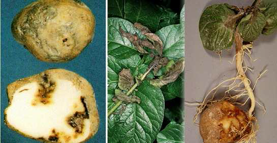 شكل2: اعراض الاصابة بالندوة المتأخرة على النباتات الناتجة من درنات مصابة (يمين الشكل) وعلى الاوراق (وسط الشكل) والدونات (يسار الشكل)