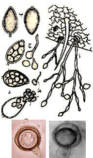 شكل1: (أ) حوامل الفطر فيتوفثورا انفستانز خارجة من الثغور (ب) الحوافظ الأسبورانجية (ج) الانبات المباشر (د)الغير مباشر (هـ) الحوافظ الأسبورانجية وانتاج الجراثيم الهدبية السابحة * وشكل الجرثومة البيضية (اسفل الشكل).