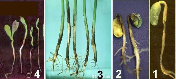 شكل2: موت البادرات المتسبب عن الفطريات 1- بيثيوم, 2- فيتوفثورا, 3- ريزكتونيا, 4- الترناريا.