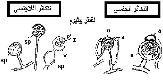 شكل1: التكاثر اللاجنسي والجنسي للفطر بيثيوم. Sp= اسبورانجيوم, z= جراثيم سابحة, v= مثانة, a= انثريديوم, o= اوجونيوم