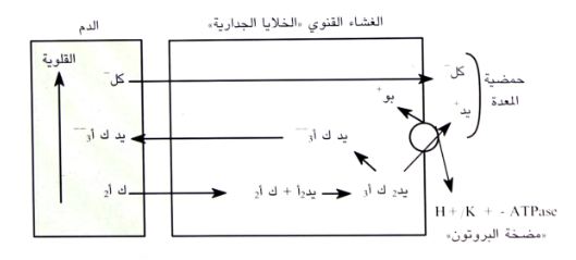 - يتم ضخ (يد +) إلى داخل تجويف الخلايا القنوية في تبادل مع أيونات البوتاسيوم بفعل دور مضخة البروتون (ما يسمى بدورة البوتاسيوم (بو +).