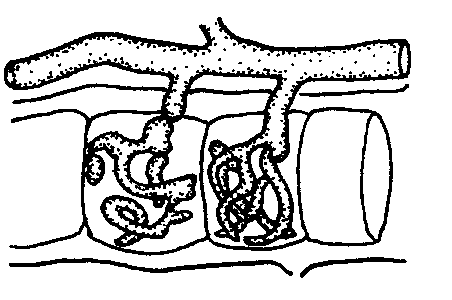 شكل (7) بعض اشكال الممصات (اعضاء الامتصاص) التي تكونها الفطريات داخل خلايا العائل.