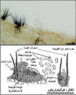 شكل (5) يوضح مظهر الكويمات الكونيدية (اعلى الشكل) كما تبدو على سطح العائل (باستخدام عدسة مكبرة) وتركيبها التفصيلي (اسفل الشكل).
