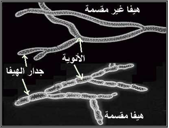 والهيفات الفطرية قد تكون متفرعة أو غير متفرعة كما أنها قد تكون مقسمة بجدر عرضية إلى خلايا كل منها يوجد به نواة واحدة أو اثنتين أو تكون ذات أنوية متعددة (شكل١)، ومن ناحية أخرى قد تكون الهيفات الفطرية غير مقسمة تبدو كخيوط أنبوبية يظهر البروتوبلازم (السيتوبلازم والأنوية) مستمر على امتداد الهيفا التي يطلق عليها في هذه الحالة مصطلح "مدمج خلوي". والميسيليوم قد يكون عديم اللون أو قد يتخذ مظهرا قطنيا ذو لون أبيض أو أحمر أو برتقالي أو أسود أو مصبوغا بألوان أخرى كما أنه قد يكون ميسيليوما عقيما أو تخرج عليه الجراثيم إما مباشرة أو محمولة على حوامل جرثومية كما سيأتي وصفه فيما بعد.